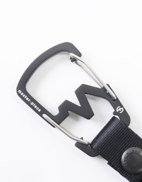 A key ring featuring a two-gate structure aluminum carabiner with a two-gate structure with a master-piece logo mark. The nylon tape part has a double ring so you can attach a key.