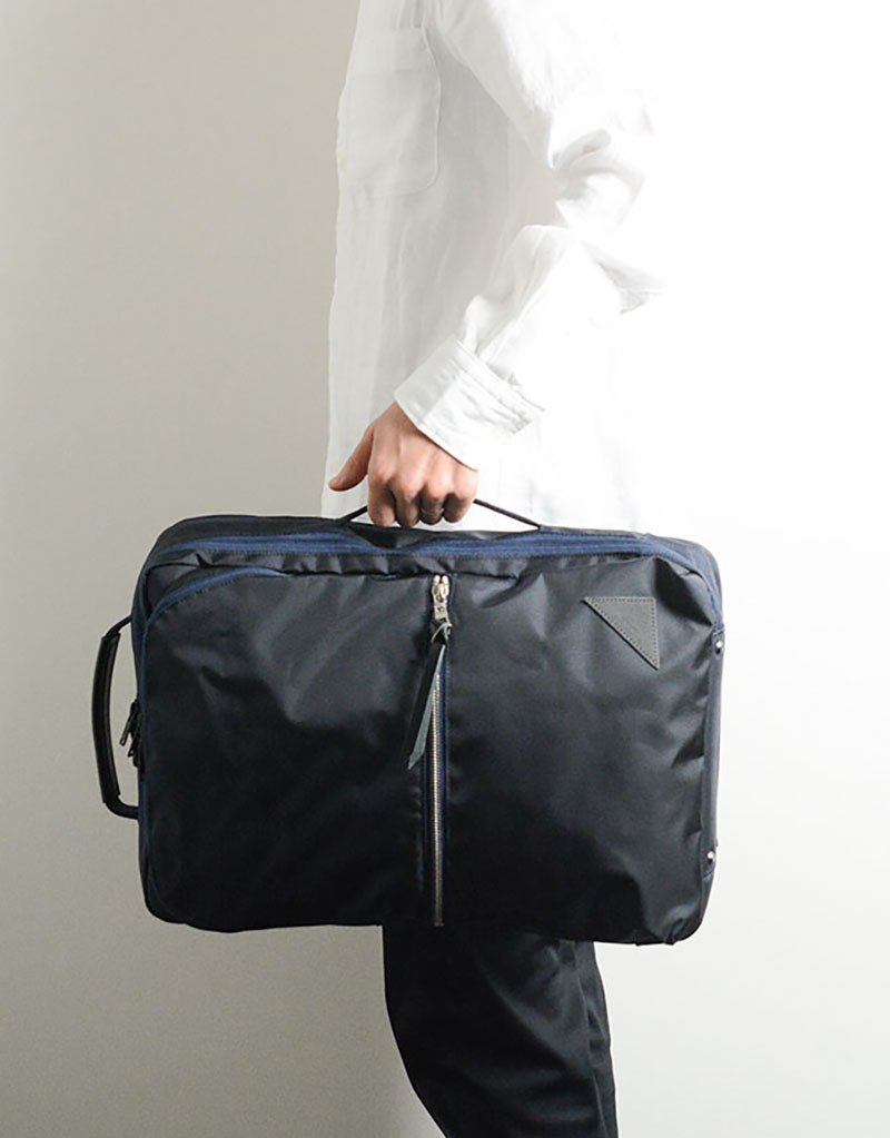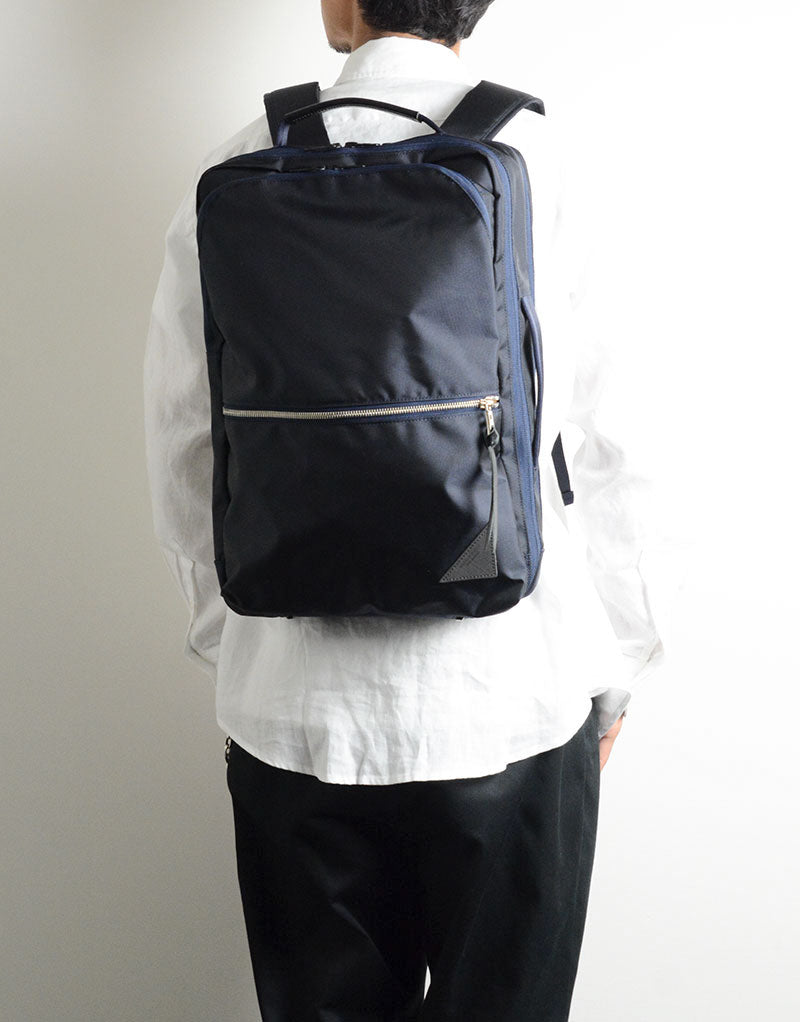 The body fabric is made from Yorofu®, an ultra-strong nylon fabric created using Toray's cutting-edge technology. Unlike conventional 66 nylon, this fabric uses the world's highest level of high-strength nylon thread, using high-viscosity polymer technology and spinning technology. Furthermore, we use a material that is stronger and more durable than conventional 66 nylon, and is a combination of purely domestic technology. The surface of this Armor Cloth® 420D nylon is treated with a durable super water-repellent finish, and the back side is coated with three different layers to make it lightweight and waterproof. The attached fabric is INVISTA's 1680D Cordura Ballistic® nylon, which has approximately 5 times the wear and tear strength and durability of regular nylon, and the back side is PVC treated to further improve strength and waterproofness. I am. In addition, the included leather is eco-nume cow leather that has been tested for hazardous substances (JES) according to the 13 standards of the Japan Leather Technology Association and is tanned with vegetable tannin without using any hexavalent chromium, a substance that is harmful to the human body. doing. The front pocket zipper uses YKK EXCELLA, each element of which has been carefully polished, and other parts are made from as little metal as possible to reduce weight. The triangular name has a retroreflective function and is designed for safety at night. There is space to store laptops, tablets, etc. With its simple design and color, this series is suitable for a variety of situations, whether it's on or off.