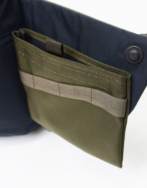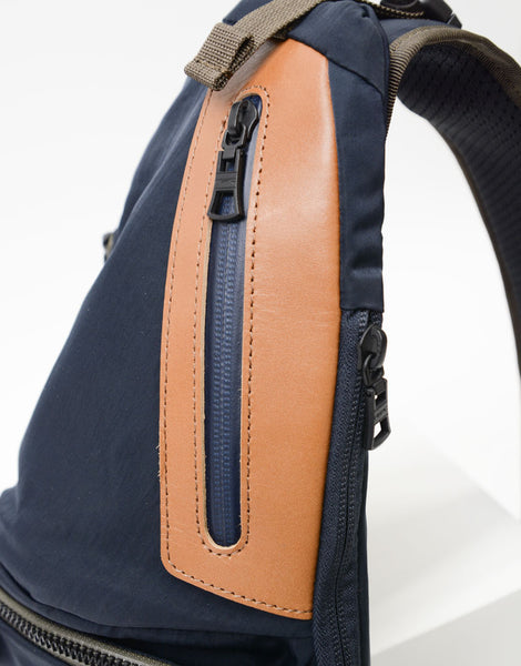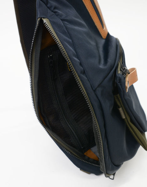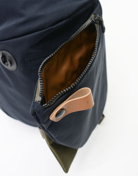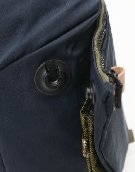 The main body material is a lightweight yet tightly made domestic nylon twill made from 110d warp thread and 210d weft. Liquid flow dyeing (also known as jet dyeing, a method of dyeing the fabric onto the flow of dye that is sprayed from the nozzle) creates a natural wrinkled feel and a calm gloss. After dyeing, the surface of the fabric is treated with a weak water-repellent finish.