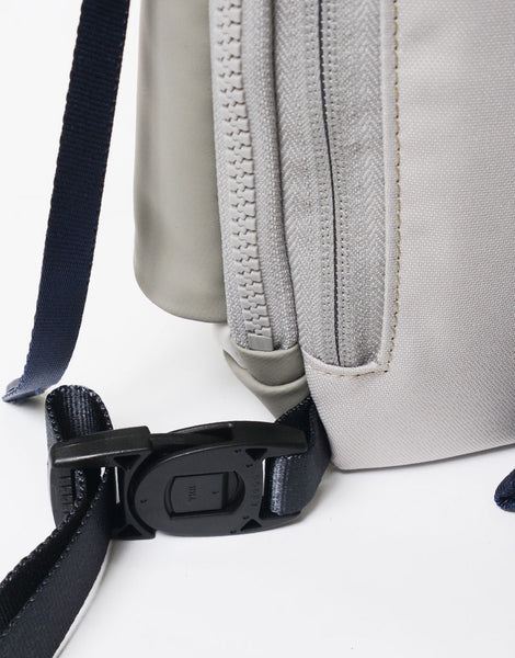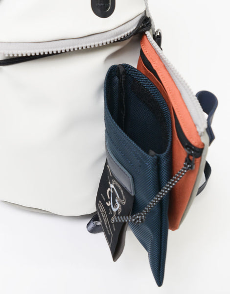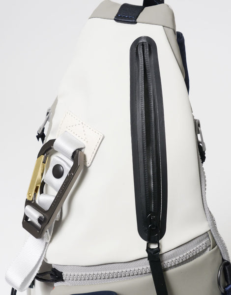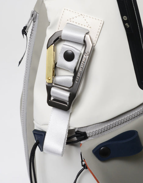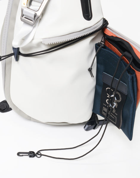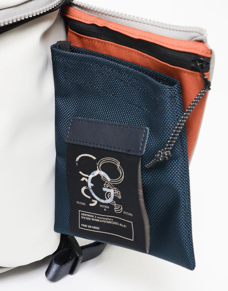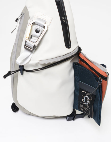 本体素材は環境汚染の誘因となる溶剤等を約 90% 排除された環境に優しいエコな高耐久ポリウレタンを表面にコーティングした 600d ポリエステル生地を使用しており、 マット調のゴムライクな雰囲気が特徴的な素材となります。ポケットに使用している付属生地には通常ナイロンの約 5 倍の摩耗・引き裂き強度・耐久性を持つ INVISTA 社の1680d コーデュラバリスティック ® ナイロンを使用しています。 引手には高密度のコラボレーションロゴ入りの織りネームを採用しており、付属のシリコンパーツもオリジナルとなっています。 又、ラバーシートで縁取りした収納部は透湿防水生地を使用し耐水性の高い仕様となっており、 前面のファスナーから伸びたナイロンコードによって開閉がスムーズになるギミックが施されています。 定番型では使用していないオリジナルカラビナなどのパーツ類や、織りネームなど、グーピーメイドとのコラボレーションならではの特別なモデルです。