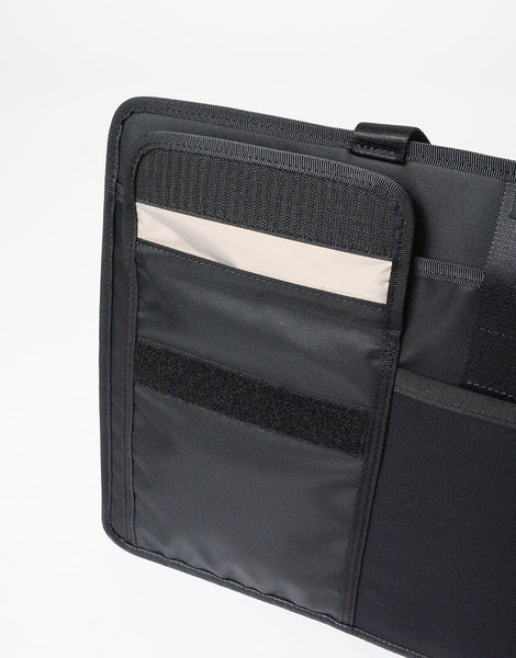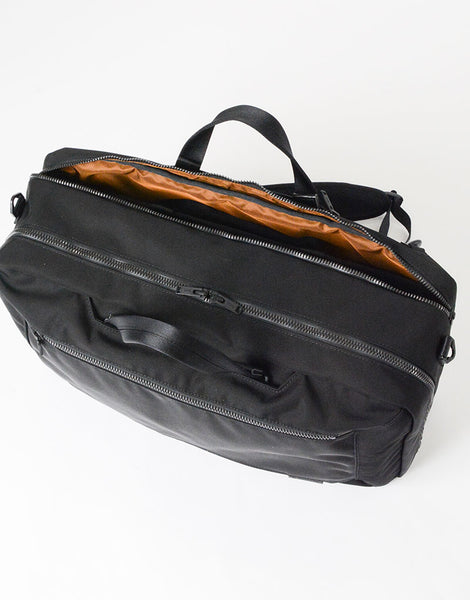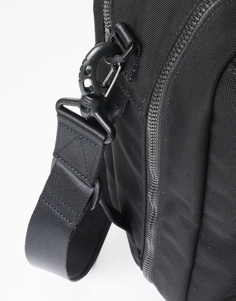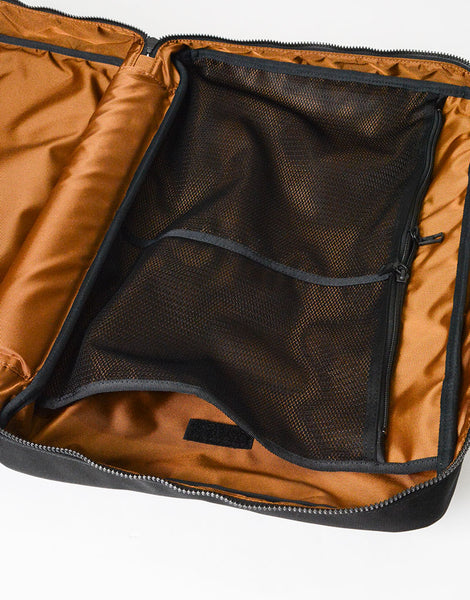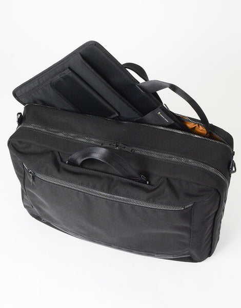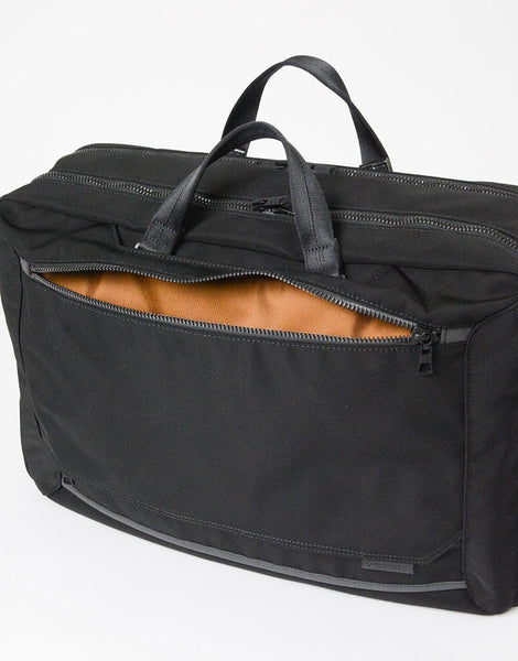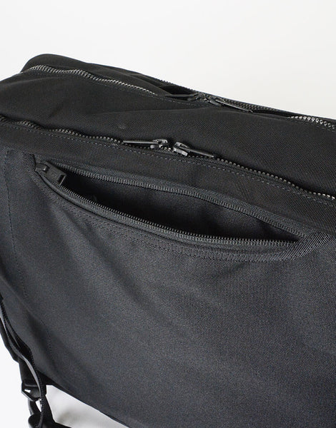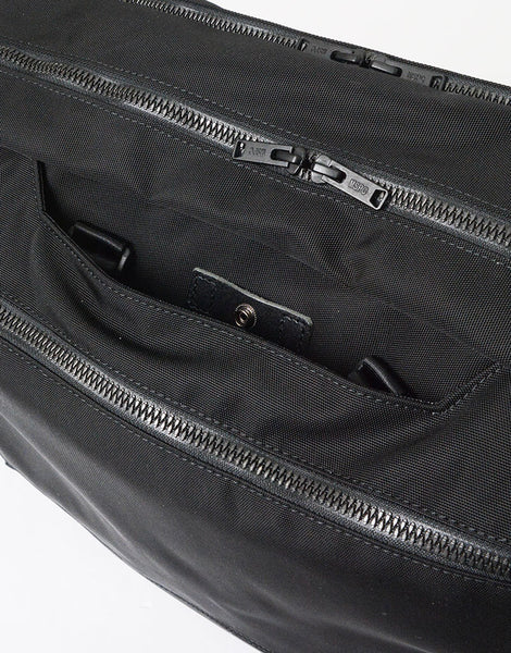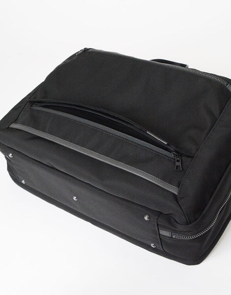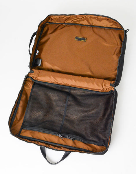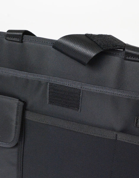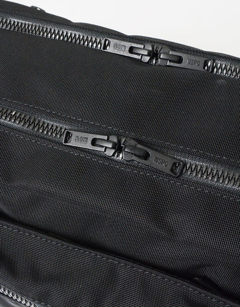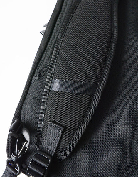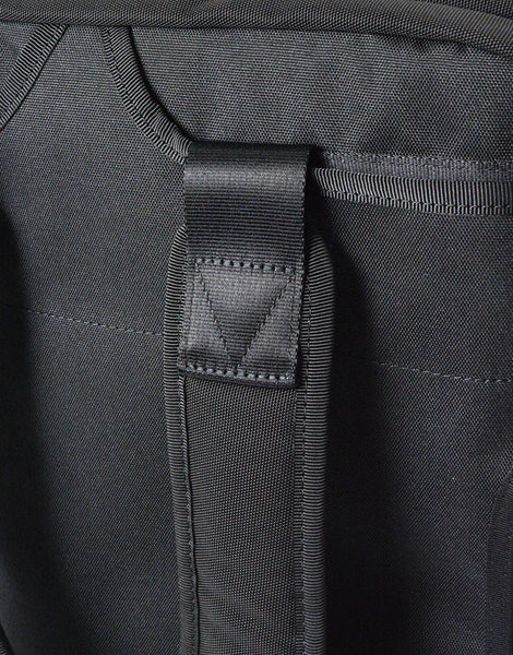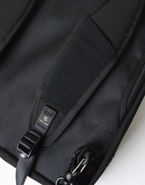 本体にはタテ糸 1260d× ヨコ糸 630d の強撚・高密度ナイロンを使用しています。強撚糸を使用することにより、生地にシボ感が強く表れ、平織りでありながら立体的な表情があり、またハリとコシがありシワになりにくい特性も持っています。表面にはテフロン ® 加工を施していますので、撥水性・防汚性があります。 付属のレザーは、革の風合いを残しながら表面に粘着性の高いバインダーでリフレクトシートを貼り付けています。 再帰反射機能があり夜間の安全性にも考慮しています。メインファスナーはメタルの外観を持ち、重さは金属ファスナーの約半分と軽量な YKK 社製 METALUXE を使用しています。 機能面では社内やワークスペース、自宅で使用するのに便利な脱着可能のワークパッドを装備。 芯材と背面のスタンドで自立し、ラップトップやタブレットの収納の他、電波を遮断する特殊な生地を使用したフラップポケットが付いており、スキミングの防止だけでなく、携帯電話を収納しておくことで電波が遮断され集中して作業したい場合に最適です。フロント下部のファスナーポケットの袋布には撥水・防水性に優れた軽量な 3 レイヤーナイロン、底部分には PVC メッシュを使用しているのでペットボトルや折りたたみ傘の収納に便利です。バックパックのハーネスには、ワイヤレスヘッドホンや IC カードの収納に便利なストレッチ素材のメッ シュポケットを装備しています。