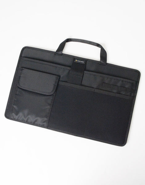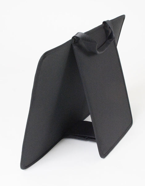 ワークパッドは芯材と背面のス タンドで自立し、ラップトップ やタブレット等の収納が可能。