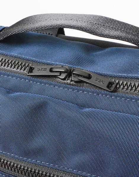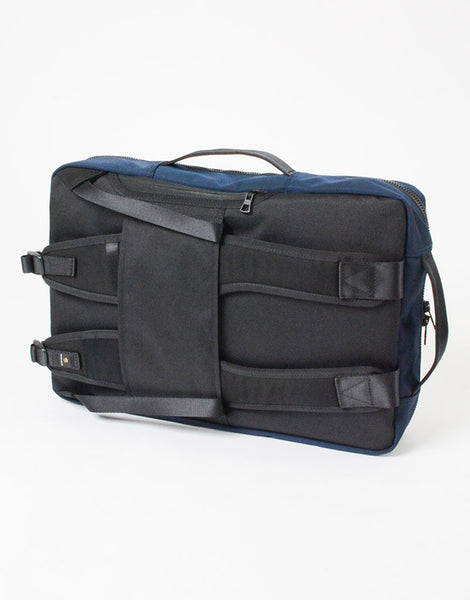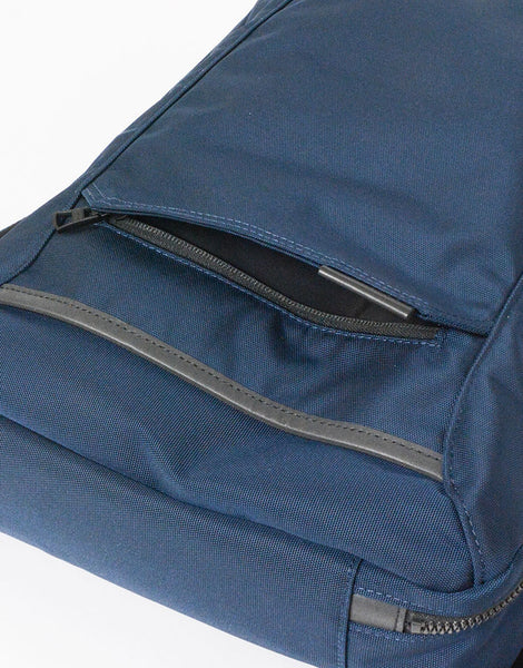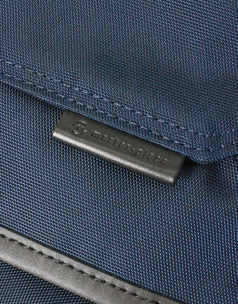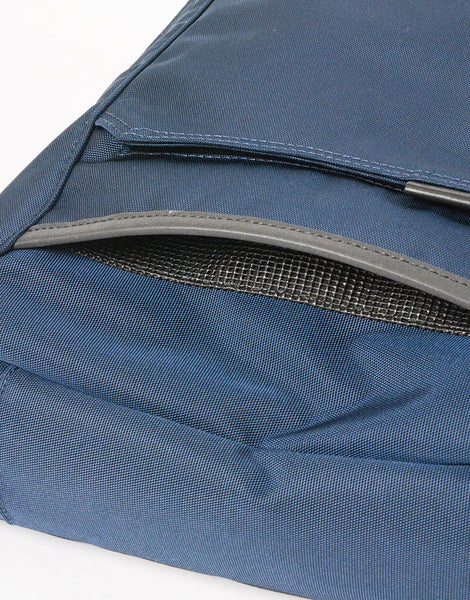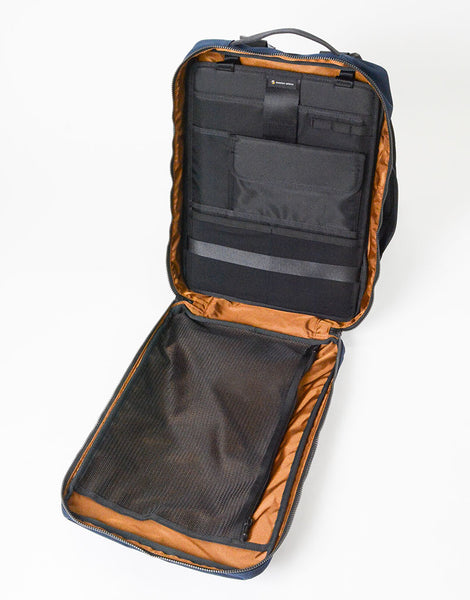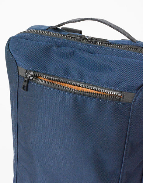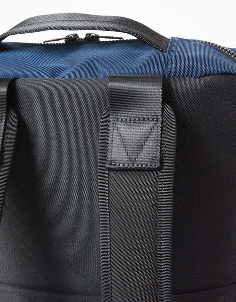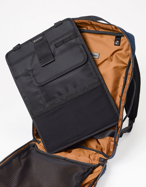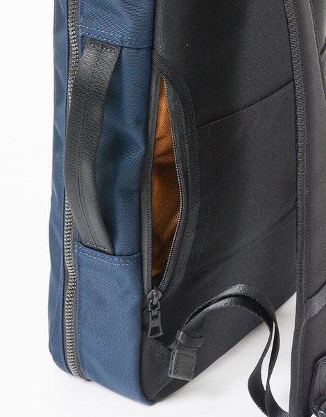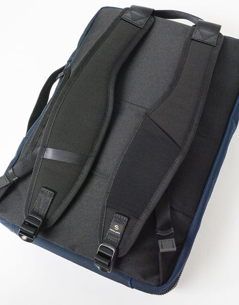 本体にはタテ糸 1260d× ヨコ糸 630d の強撚・高密度ナイロンを使用しています。強撚糸を使用することにより、生地にシボ感が強く表れ、平織りでありながら立体的な表情があり、またハリとコシがありシワになりにくい特性も持っています。表面にはテフロン ® 加工を施していますので、撥水性・防汚性があります。 付属のレザーは、革の風合いを残しながら表面に粘着性の高いバインダーでリフレクトシートを貼り付けています。 再帰反射機能があり夜間の安全性にも考慮しています。メインファスナーはメタルの外観を持ち、重さは金属ファスナーの約半分と軽量な YKK 社製 METALUXE を使用しています。 機能面では社内やワークスペース、自宅で使用するのに便利な脱着可能のワークパッドを装備。 芯材と背面のスタンドで自立し、ラップトップやタブレットの収納の他、電波を遮断する特殊な生地を使用したフラップポケットが付いており、スキミングの防止だけでなく、携帯電話を収納しておくことで電波が遮断され集中して作業したい場合に最適です。フロント下部のファスナーポケットの袋布には撥水・防水性に優れた軽量な 3 レイヤーナイロン、底部分には PVC メッシュを使用しているのでペットボトルや折りたたみ傘の収納に便利です。バックパックのハーネスには、ワイヤレスヘッドホンや IC カードの収納に便利なストレッチ素材のメッ シュポケットを装備しています。