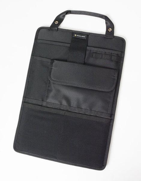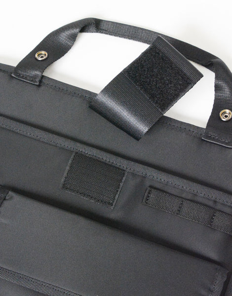背面のテープにショルダーストラップを収納して、ブリーフケースとして使用することも可能です。