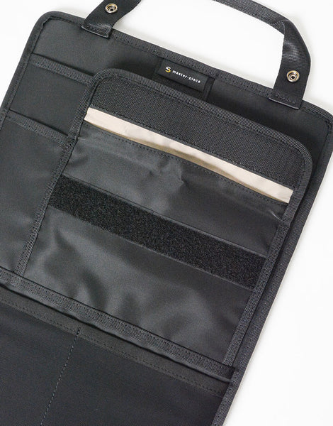 全開するメイン収納。 背面側にはワークパッドが付属しています。前面側にはメッシュのポケットがついています。