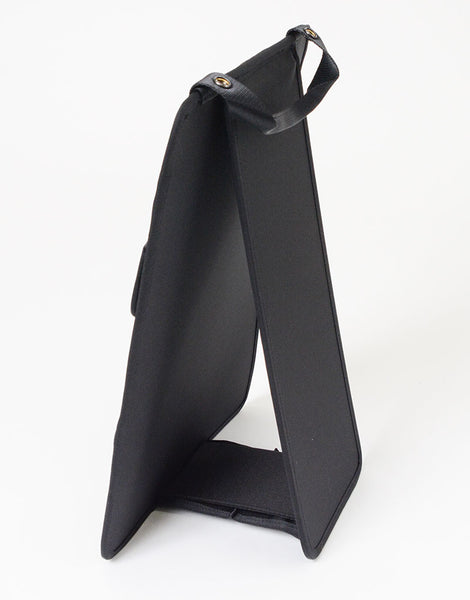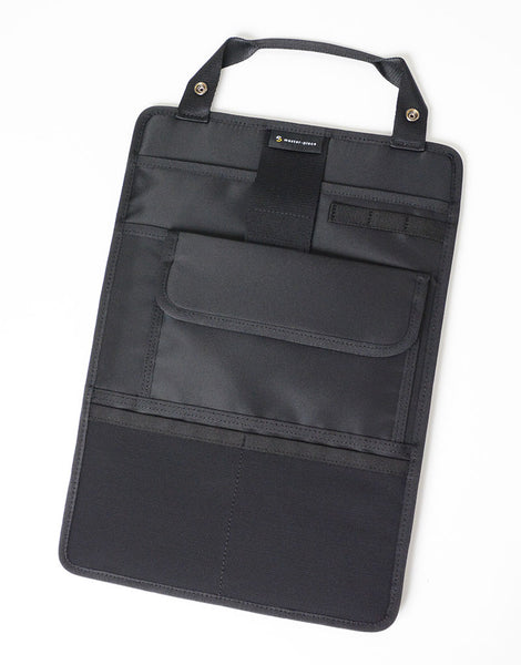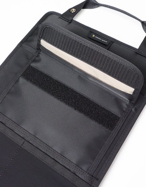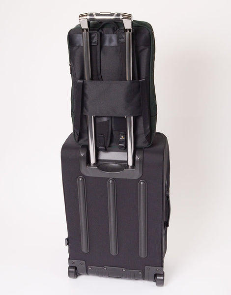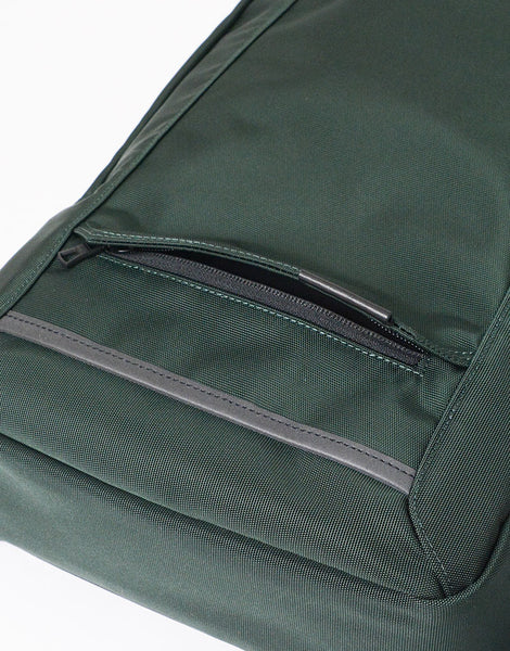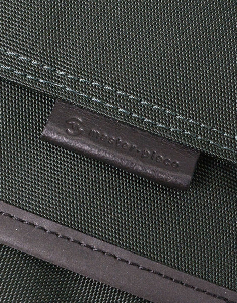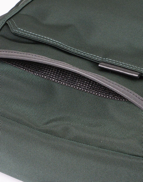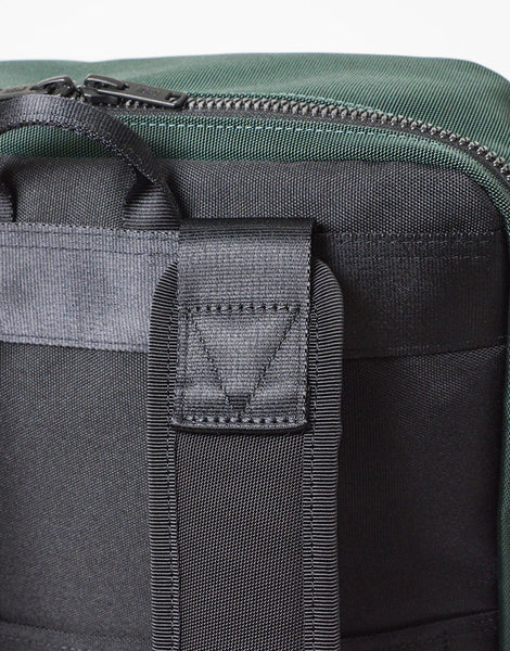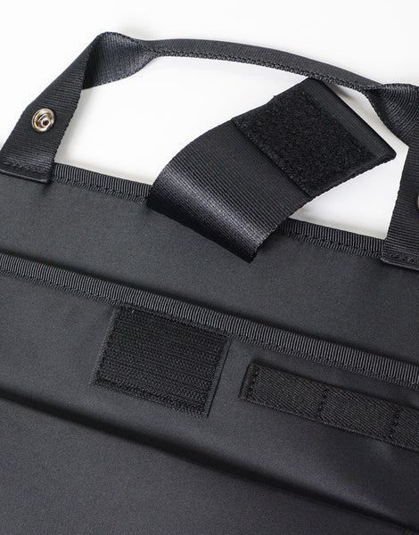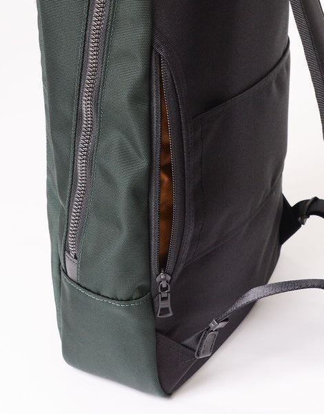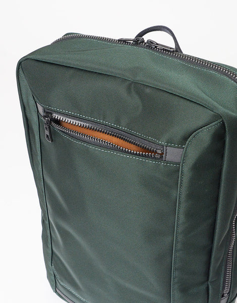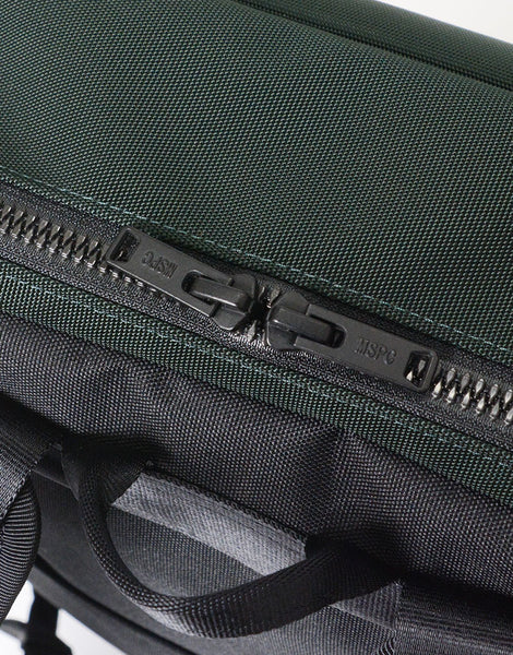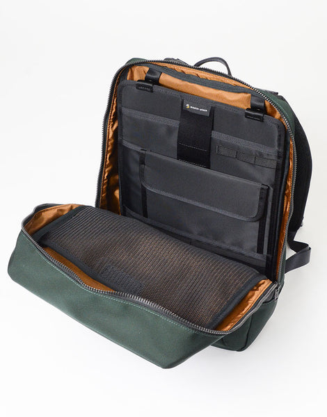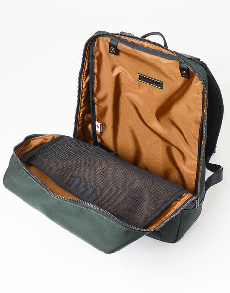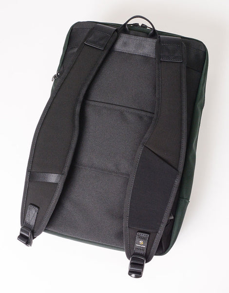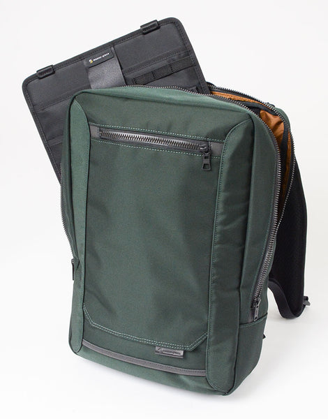 本体にはタテ糸 1260d× ヨコ糸 630d の強撚・高密度ナイロンを使用しています。強撚糸を使用することにより、生地にシボ感が強く表れ、平織りでありながら立体的な表情があり、またハリとコシがありシワになりにくい特性も持っています。表面にはテフロン ® 加工を施していますので、撥水性・防汚性があります。 付属のレザーは、革の風合いを残しながら表面に粘着性の高いバインダーでリフレクトシートを貼り付けています。 再帰反射機能があり夜間の安全性にも考慮しています。メインファスナーはメタルの外観を持ち、重さは金属ファスナーの約半分と軽量な YKK 社製 METALUXE を使用しています。 機能面では社内やワークスペース、自宅で使用するのに便利な脱着可能のワークパッドを装備。 芯材と背面のスタンドで自立し、ラップトップやタブレットの収納の他、電波を遮断する特殊な生地を使用したフラップポケットが付いており、スキミングの防止だけでなく、携帯電話を収納しておくことで電波が遮断され集中して作業したい場合に最適です。フロント下部のファスナーポケットの袋布には撥水・防水性に優れた軽量な 3 レイヤーナイロン、底部分には PVC メッシュを使用しているのでペットボトルや折りたたみ傘の収納に便利です。バックパックのハーネスには、ワイヤレスヘッドホンや IC カードの収納に便利なストレッチ素材のメッ シュポケットを装備しています。