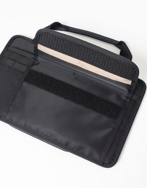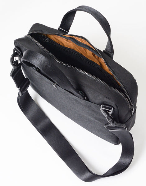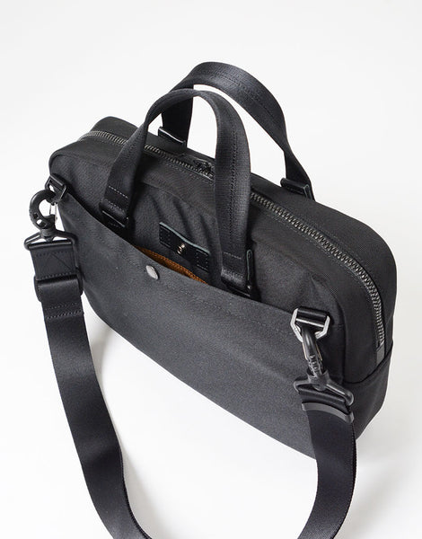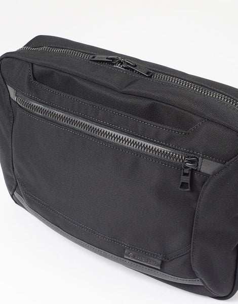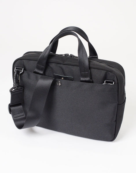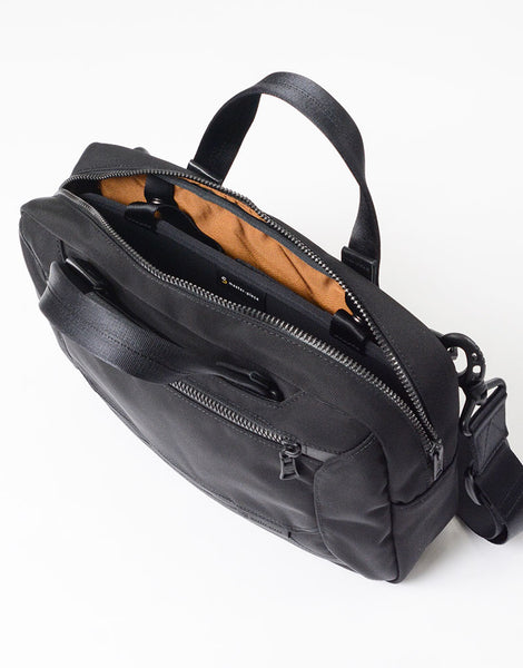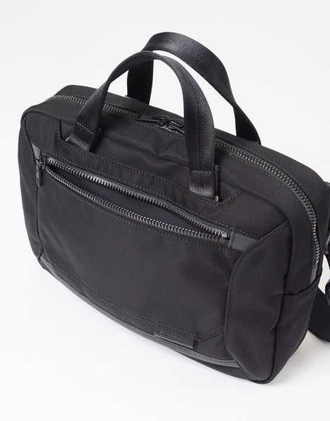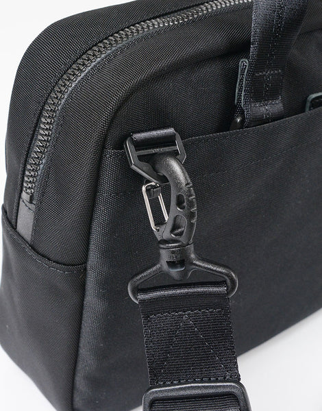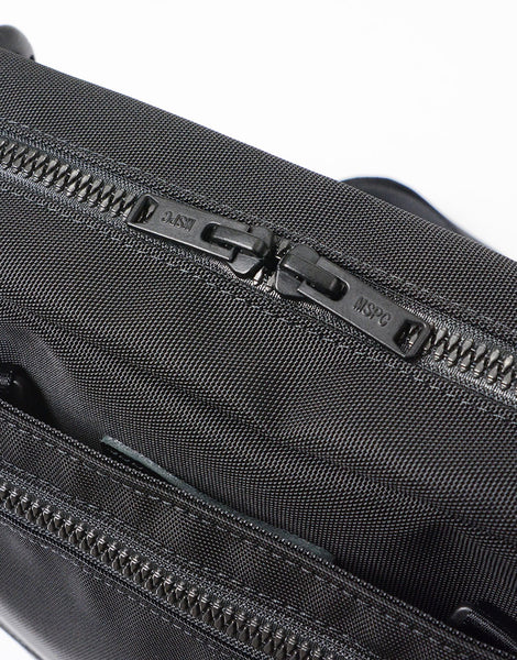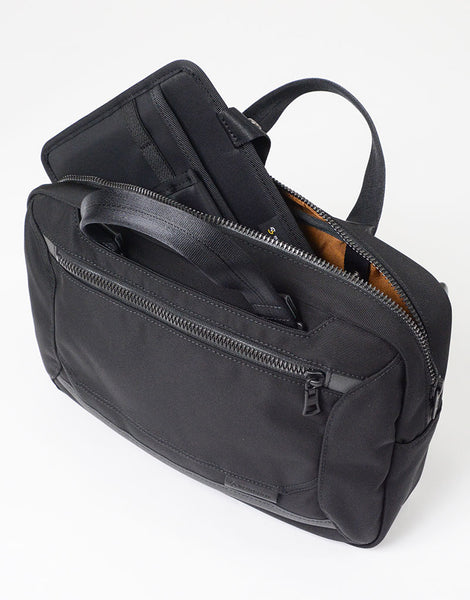 本体にはタテ糸 1260d× ヨコ糸 630d の強撚・高密度ナイロンを使用しています。強撚糸を使用することにより、生地にシボ感が強く表れ、平織りでありながら立体的な表情があり、またハリとコシがありシワになりにくい特性も持っています。表面にはテフロン ® 加工を施していますので、撥水性・防汚性があります。 付属のレザーは、革の風合いを残しながら表面に粘着性の高いバインダーでリフレクトシートを貼り付けています。 再帰反射機能があり夜間の安全性にも考慮しています。メインファスナーはメタルの外観を持ち、重さは金属ファスナーの約半分と軽量な YKK 社製 METALUXE を使用しています。 機能面では社内やワークスペース、自宅で使用するのに便利な脱着可能のワークパッドを装備。 芯材と背面のスタンドで自立し、ラップトップやタブレットの収納の他、電波を遮断する特殊な生地を使用したフラップポケットが付いており、スキミングの防止だけでなく、携帯電話を収納しておくことで電波が遮断され集中して作業したい場合に最適です。フロント下部のファスナーポケットの袋布には撥水・防水性に優れた軽量な 3 レイヤーナイロン、底部分には PVC メッシュを使用しているのでペットボトルや折りたたみ傘の収納に便利です。バックパックのハーネスには、ワイヤレスヘッドホンや IC カードの収納に便利なストレッチ素材のメッ シュポケットを装備しています。