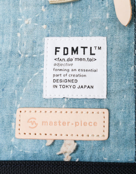 master-piece の定番 link シリーズをベースに FDMTL のアイコンとも言える襤褸・デニムパッチワーク柄をコンブ ®-エヌとモナリザ ® の高精度加工技術により、旧来のプリント加工を超 越した鮮明度を可能としたプリントファブリックと master-piece ならではの、様々な異素材を組み合わせたコラボレーションシリーズです。
