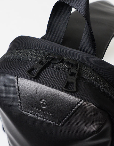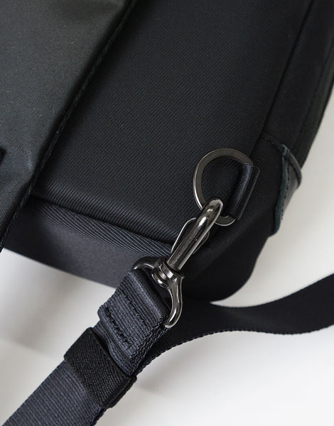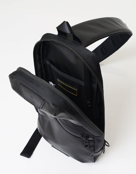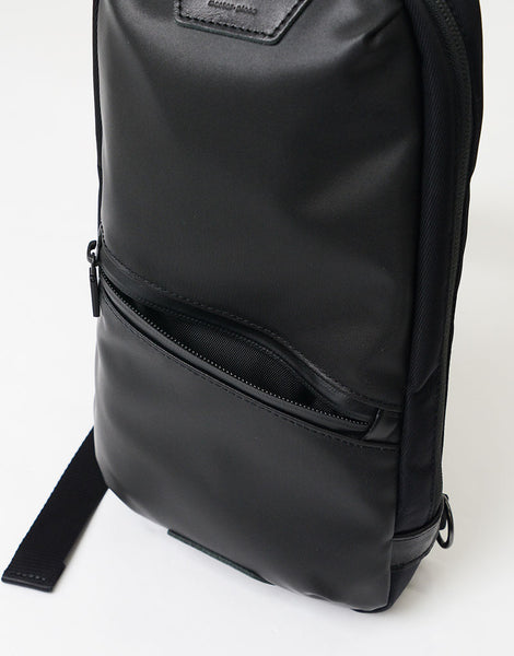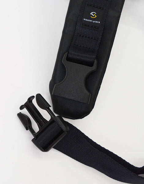 master-piece( マスターピース)のProgress-sc(プログレス エスシー)シリーズのショルダーバッグ。本体素材に環境に優しいポリウレタンをコーティングを施した600d ポリエステル生地を使用し、絶妙な光沢感を持たせながらゴムライクな質感とマットな素材感が特徴です。生地の裏面にはPVCコーティングが施され、防水性とハリ感を実現しています。内装の生地には抗菌・防臭効果のある 420d のナイロン生地を使用し、臭いの原因となる黄色ブドウ状球菌の繁殖を制御するため、その分泌物から発生する悪臭を防止します。ユニセックスに適したマットな表情で、限られた荷物や必需品などを持ち運ぶネオワーカー、もちろんタウンユースでも活躍。バイシクルスタイルとの相性は抜群です。