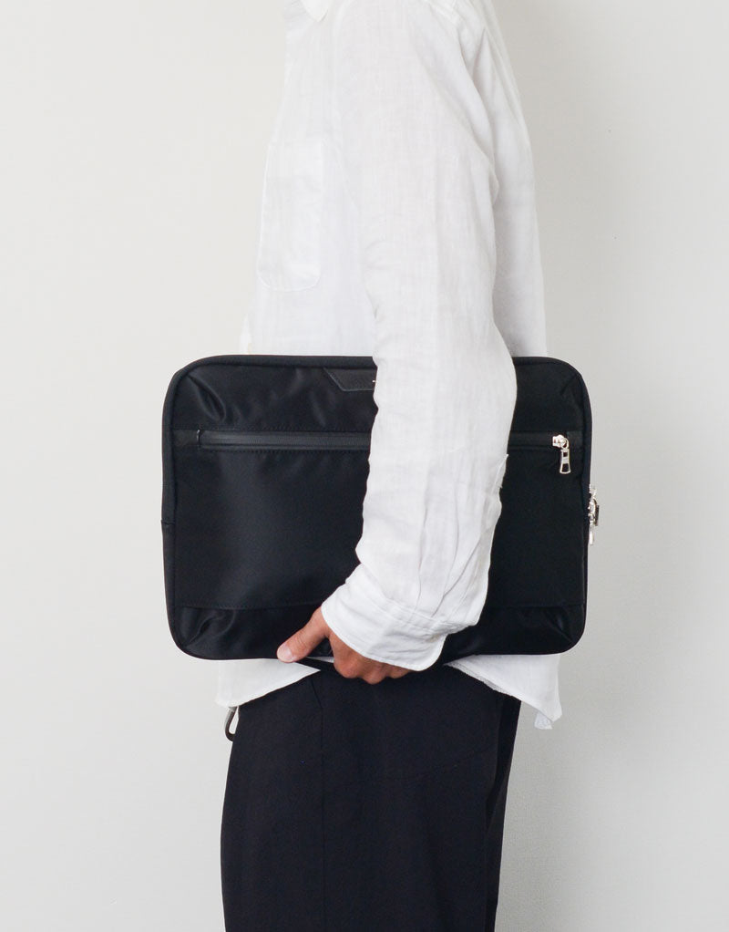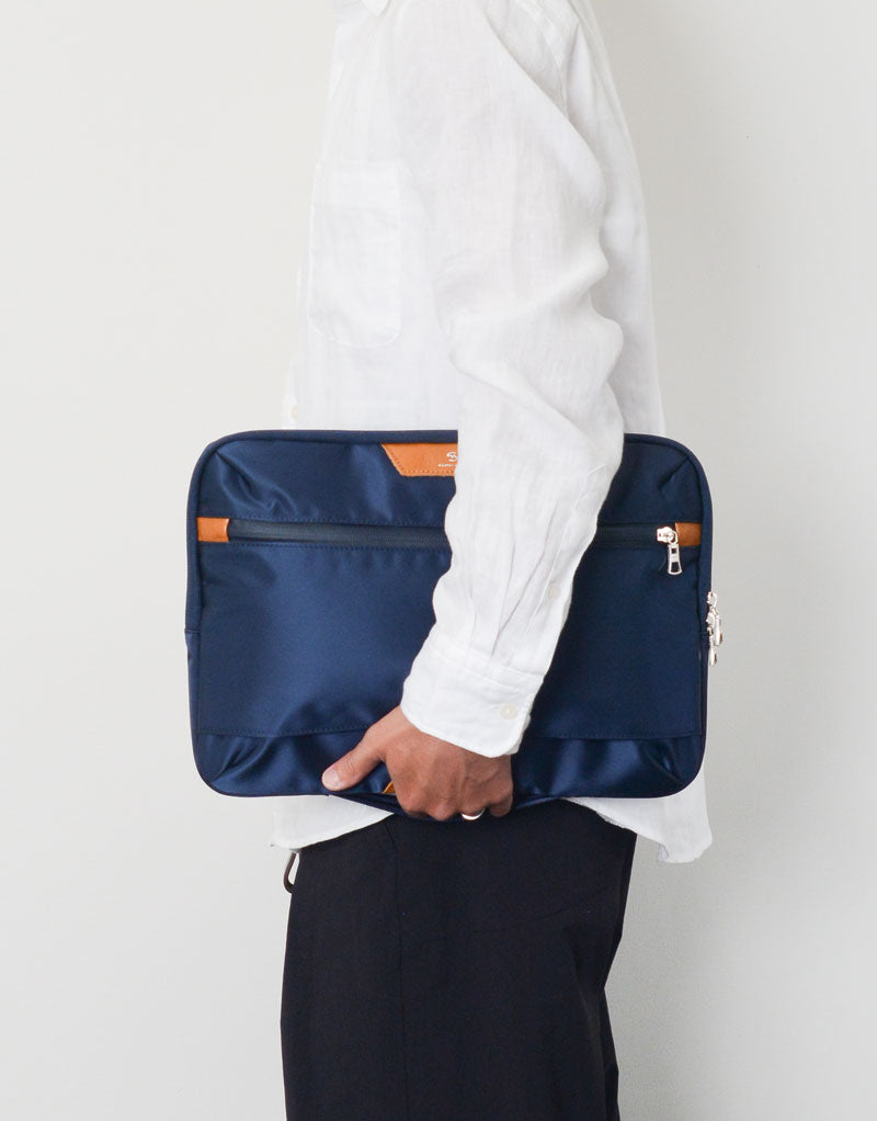 光沢感のあるナイロンツイルによる上品な表情とコンビネーションに使用されたカウレザーが印象的なmaster-piece( マスターピース)のProgress(プログレス)シリーズのPCケース。生地の裏面にはPVCコーティングが施され、防水性とハリ感を実現しています。今までありそうでなかった高級感のあるスポーティなスタイルは、仮にバッグ内に侵入した雨などからPCを守ります。MacBook Proの13inchサイズまで対応する機能美に優れた頼れるPC スリーブです。