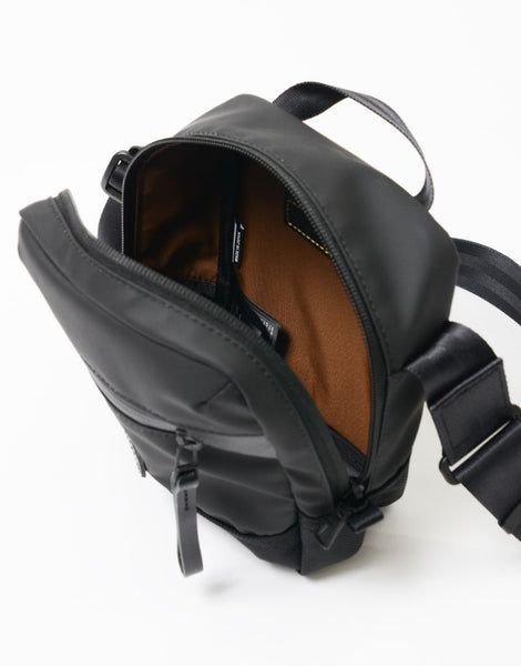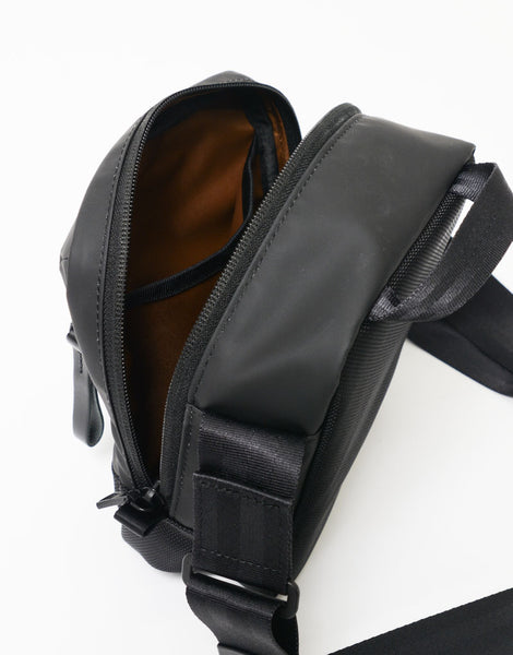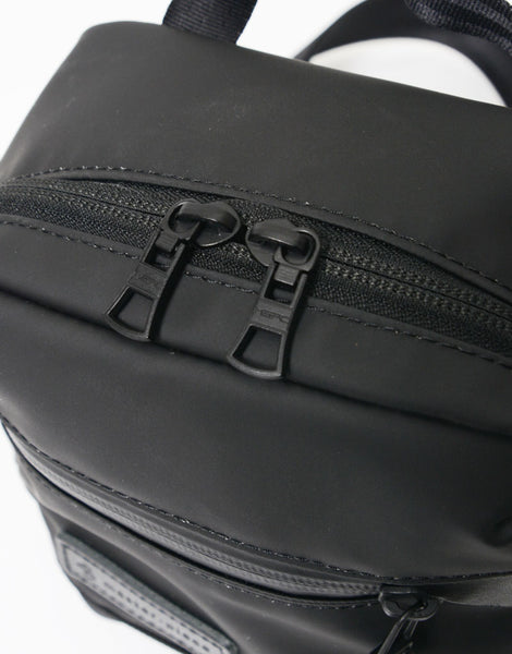 本体素材は環境汚染の誘因となる溶剤等を約 90% 排除された環境に優しいエコな高耐久ポリウレタンを表面にコーティングした 600d ポリエステル生地を使用しています。マット調の ゴムライクな雰囲気が特徴的な素材となります。付属生地は、通常ナイロンの約 5 倍の摩耗・引き裂き強度・耐久性を持つ INVISTA 社の 1680d コーデュラバリステック ® ナイロンを使 用し、裏面に PVC 加工を施すことで更なる強度と防水性を向上させています。付属レザーは、日本皮革技術協会の 13 種の基準がある有害物質検査 (JES) 済みで人体に有害な物質・六価クロムを一切使用せず、ベジタブルタンニンで鞣されたエコカ ウレザーを使用しています。