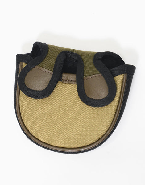 master-piece( マスターピース)のmaster-piece GOLFシリーズのパターカバー(マレットタイプ)。本体素材は CORDURA® brand fabric の生産、品質基準を満たした認定工場において、210d の 66 ナイロン糸を 2 本撚りしたものを、2 本引き揃え、タテ・ヨコに使用し織り上げた、 耐久堅牢度に 優れたオリジナルファブリック、MASTERTEX-07 になります。生地の表面には撥水加工、裏面には特殊透湿防水フィルム L-Vent® をラミネート加工し、トリコットナイ ロンを貼り合わせた 3 レイヤー 構造による耐水圧 20,000mm レベルの防水機能を備えております。またパーツにより、オリジナルファブリックである MASTERTEX-04、05、06 を 組み合わせています。付属素材もレザーは防水鞣しを施したレザーを使用、底面の素材は、通常ナイロン の約 5 倍の摩耗・引き裂き強度・耐久性を持つ INVISTA 社の 1680D コーデュ ラバリステック ® ナイロンを使用し、裏面に PVC 加工を 施すことで更なる強度と防水性を向上させています。