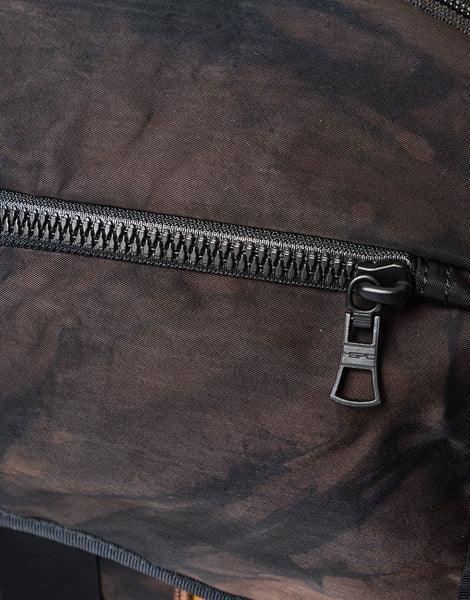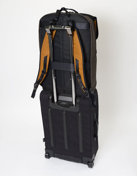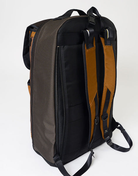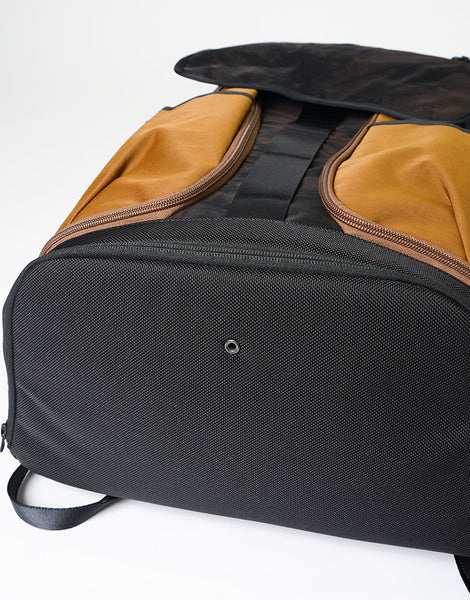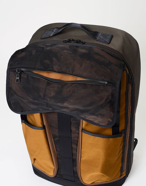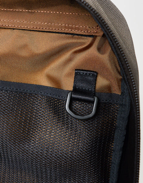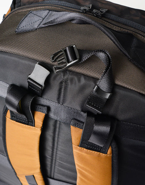 本体素材はタテ糸 110d ヨコ糸 210d を用いた、軽量ながらも目の詰まった国産ナイロンツイルです。液流染色 ( ジェット染色とも言われ、ノズルから噴射する染料の流れに生地を乗せ て染色する方法 ) することで、自然なシワ感 と落ち着いたツヤ感を表現しています。染色後、生地の表面には弱撥水加工が施されています。また本体素材と同様の生地に、職人の手作業 で行う籠染色という手法でオーバーダイ加工をしたものを付属素材として使用しています。籠染色は、網目のプレートに折りたたんだ生地を挟み込んで染めることで、染色ムラやシワ な どがランダムに表現され、一つ一つが違う味のある表情に仕上がる独特な染色方法です。 メイン収納のマチ部分の素材には、通常ナイロンの約 5 倍の摩耗・引き裂き強度・耐久性を持つ INVISTA 社の 1680d コーデュラバリスティック ® ナイロンを使用し、裏面に PU 加工 を施すことで更に強度を向上させた素材となっ ています。 No.02850・No.02851 のショルダーハーネスには、荷物の重さを軽減する、 “m-strap”というオリジナル機構(実用新案登録済)を装備しています。