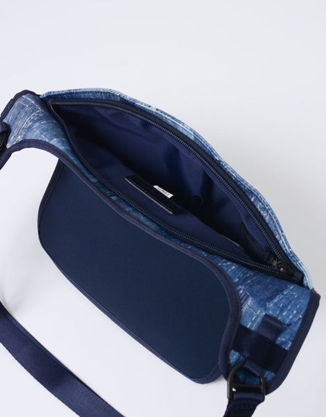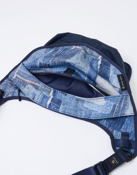 タテ・ヨコ 320d のナイロンツイルに小松マテーレ(株)のKONBU ®-Nという特殊加工を施した素材に、FDMTLによるオリジナルの襤褸・デニムパッチワーク柄を同じく小松マテーレ(株)のモナリザ ® という特殊技術を用いてプリントされた生地を使用。