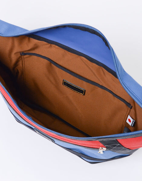 本体素材はコットンのようなルックスでありながら、コットンよりも軽量で堅牢性に優れているポリエステルを採用し、タテ・ヨコとも 600d の糸で織ったポリエステル・オックスを 使用しています。発色が良いアウトドアテイストの色に染色した後に撥水加工を施し、さらに防水性と強度を高めるために、裏面には同色の人体に有害なフタル酸を排除した PVC をコー ティングしています。付属素材のレザーには日本皮革技術協会の 13 種の基準がある有害物質検査 (JES) 済みで人体に有害な物質・六価クロムを一切使用せず、ベジタブルタンニンで 鞣されたエコカウレザーを使用しています。