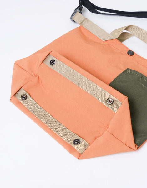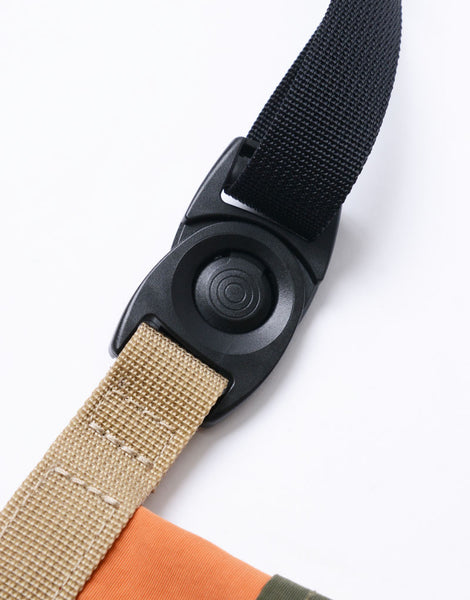 シリーズ最大の特徴である、底に設けたホックを留めることでマチを無くしたり、違うシルエットに変形することができます。またショルダーベルトを外し、本体のバックルを止めることで違うニュアンスで使用することもできます。