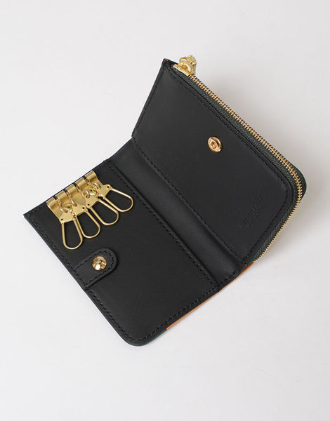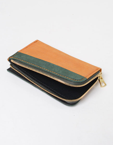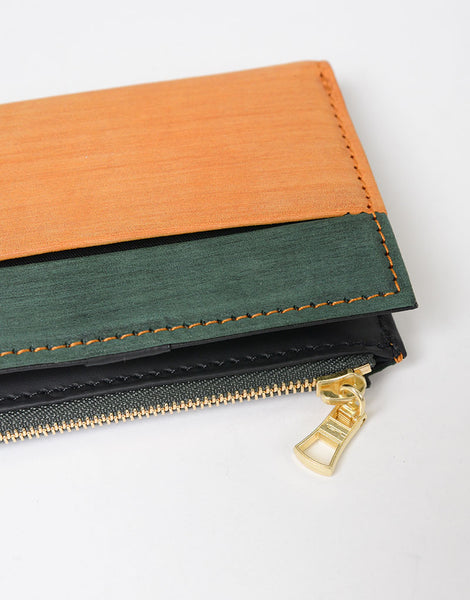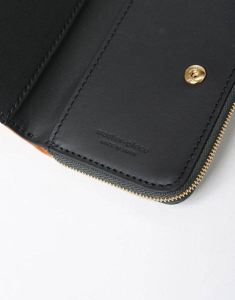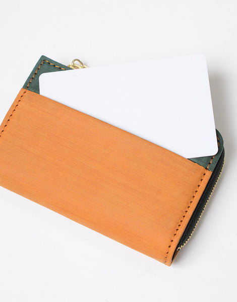本体素材は希少性の高い国産品質のホルスタインを使用しており、ベジタブルタンニンで鞣すことで耐久性や弾力性を持たせています。 さらに染色時に通常よりも多い量のオイルを 2 回に分けて時間をかけて浸透させているためタッチ感が良く、しっとりとした質感になっています。 仕上げは染料のみで仕上げ、その後、革の特徴である木目調の表情を職人の手で1枚1枚カナブラシを用いてブラッシングをかけています。 そのため 1 日に10枚程しか生産されないので、とても希少性の高い革となっています。また、経年変化も楽しめます。 付属レザーは、ヨーロッパ産原皮にクロム鞣を施したキップレザーを使用しており、ガラス仕上げをした後に特殊なウレタンで仕上げる事によりマットな質感でラバータッチになってい ます。また、摩擦に強く色落ちにも強い仕上げになっています。