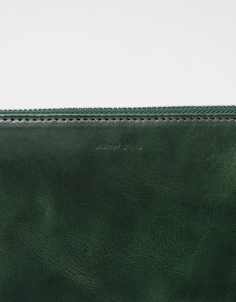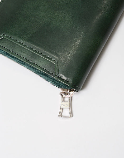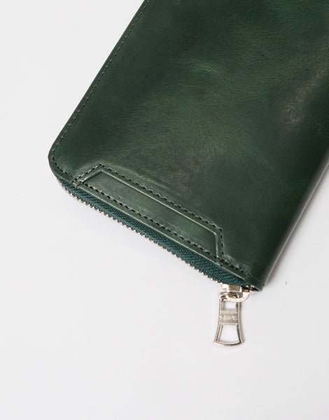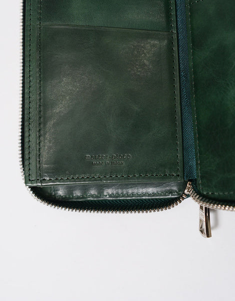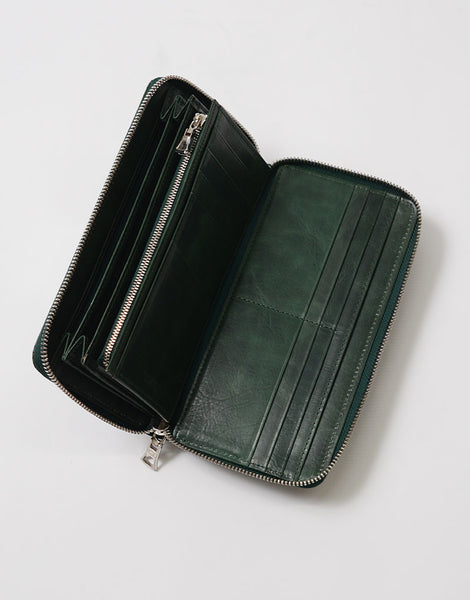 本体素材にはベジタブルタンニンで鞣されたキップレザーの表面を染料で染めた後、ワックスを手作業で丁寧に塗り込み、仕上の段階で熱を加える事により革の表面に濃淡のコントラストを出しています。キップレザーのためキメが細かく、その上にワックスを多く使用する事により磨くと色の深さや奥行きが出て経年変化が楽しめる革に仕上がっています。 ファスナーはエレメントひとつひとつ全面に入念な磨きをかけたYKK社製のEXCELLAを使用。全型共通で前面にICカードが入れられる仕様になっています。