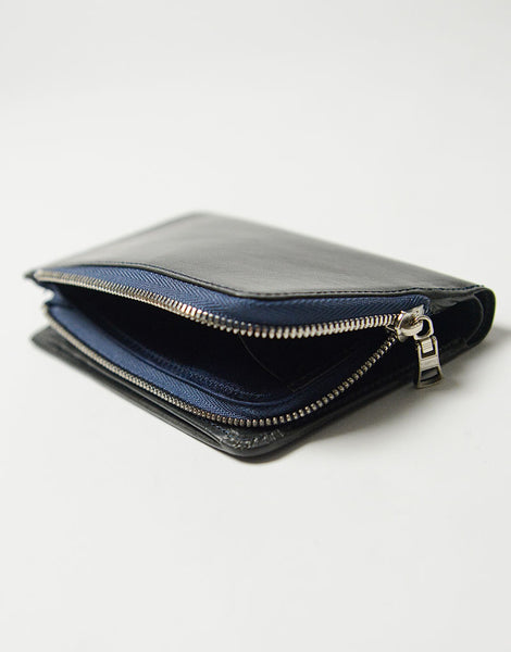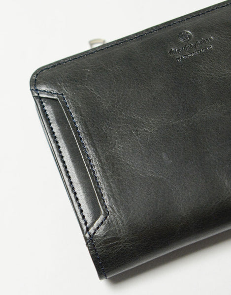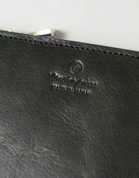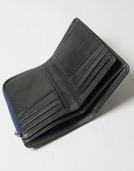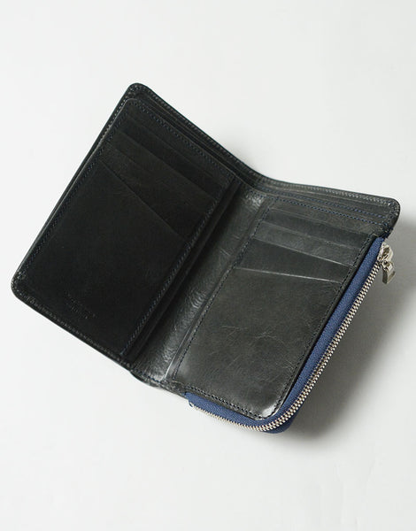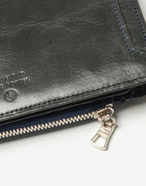 本体素材にはベジタブルタンニンで鞣されたキップレザーの表面を染料で染めた後、ワックスを手作業で丁寧に塗り込み、仕上の段階で熱を加える事により革の表面に濃淡のコントラストを出しています。キップレザーのためキメが細かく、その上にワックスを多く使用する事により磨くと色の深さや奥行きが出て経年変化が楽しめる革に仕上がっています。 ファスナーはエレメントひとつひとつ全面に入念な磨きをかけたYKK社製のEXCELLAを使用。全型共通で前面にICカードが入れられる仕様になっています。