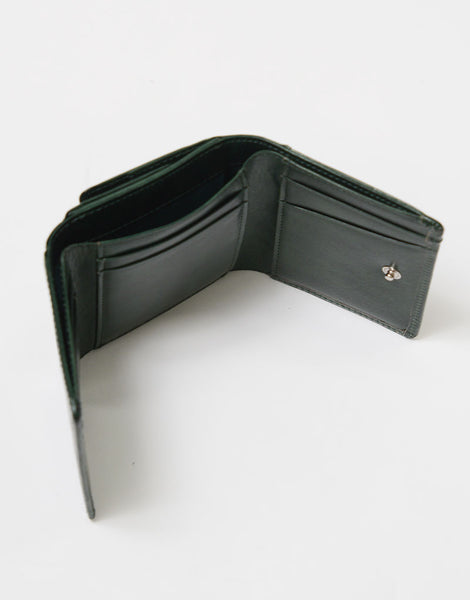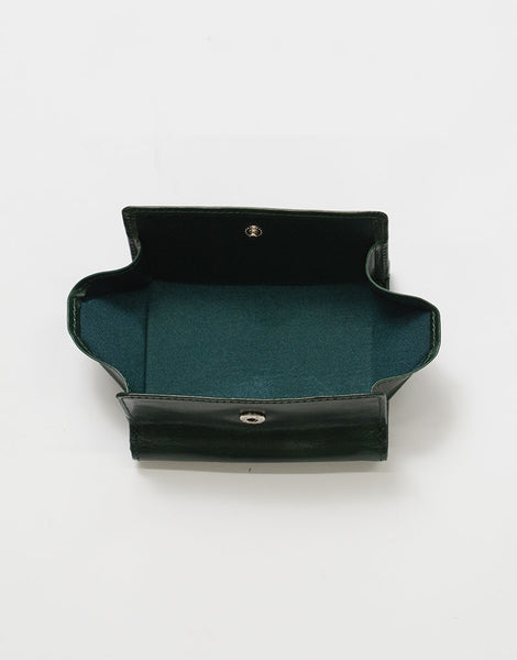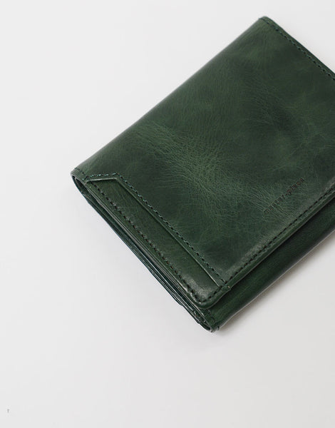 本体素材にはベジタブルタンニンで鞣されたキップレザーの表面を染料で染めた後、ワックスを手作業で丁寧に塗り込み、仕上の段階で熱を加える事により革の表面に濃淡のコントラストを出しています。キップレザーのためキメが細かく、その上にワックスを多く使用する事により磨くと色の深さや奥行きが出て経年変化が楽しめる革に仕上がっています。 ファスナーはエレメントひとつひとつ全面に入念な磨きをかけたYKK社製のEXCELLAを使用。全型共通で前面にICカードが入れられる仕様になっています。Size | W100 H85 D25mm |