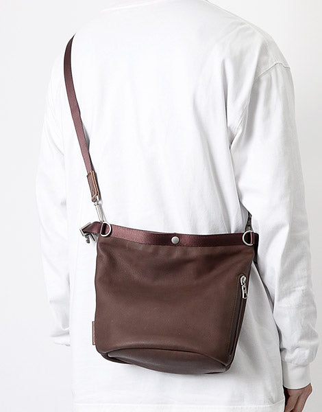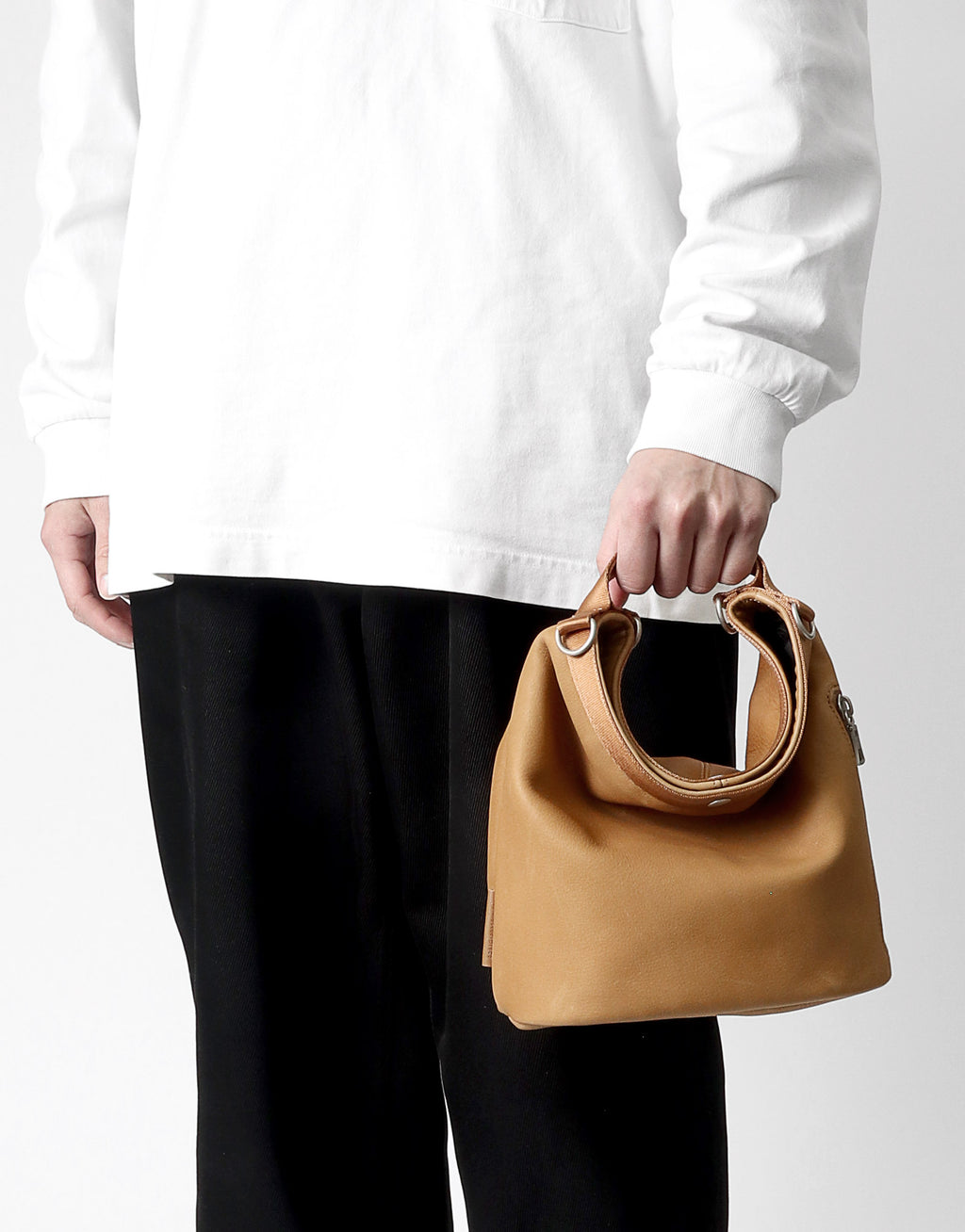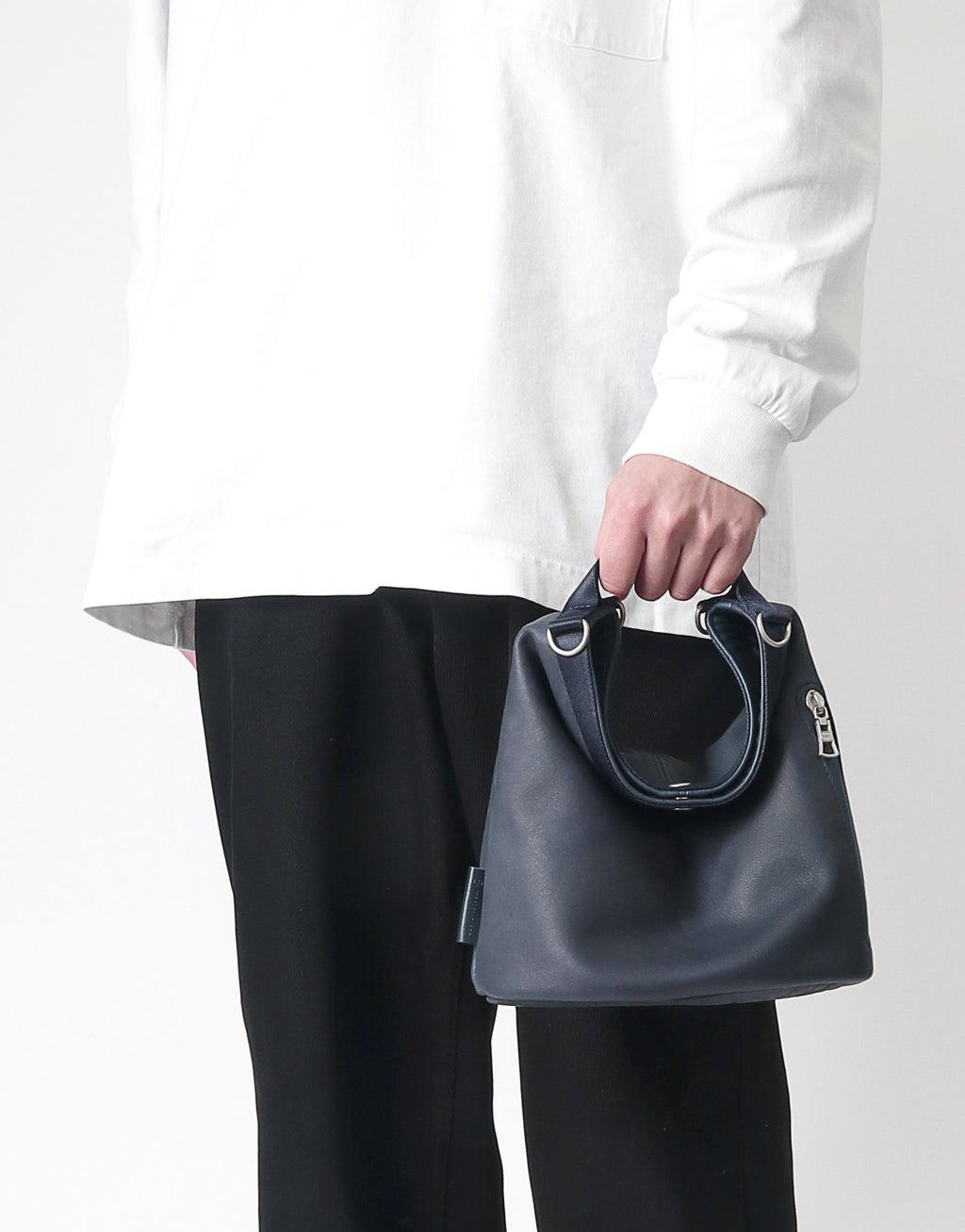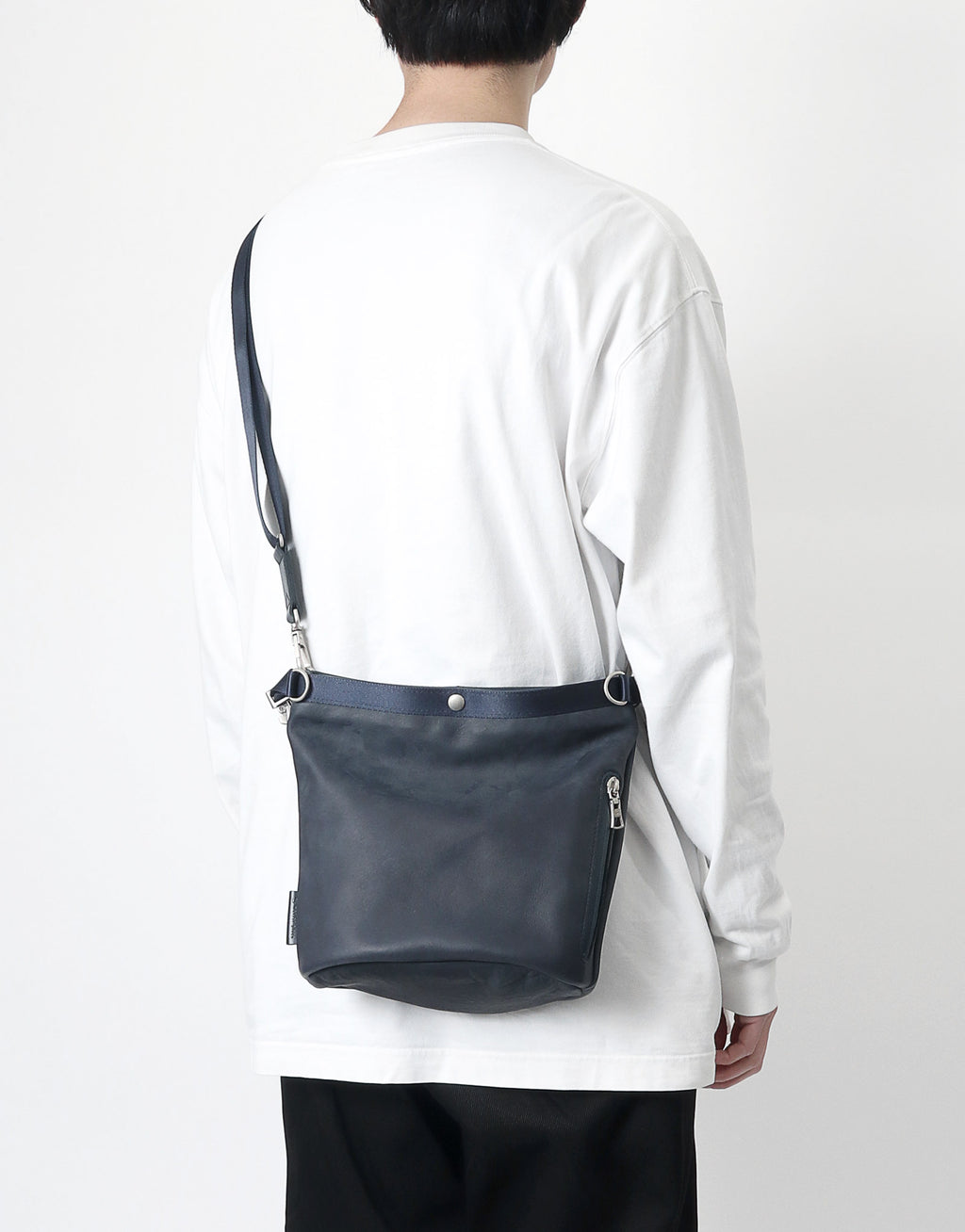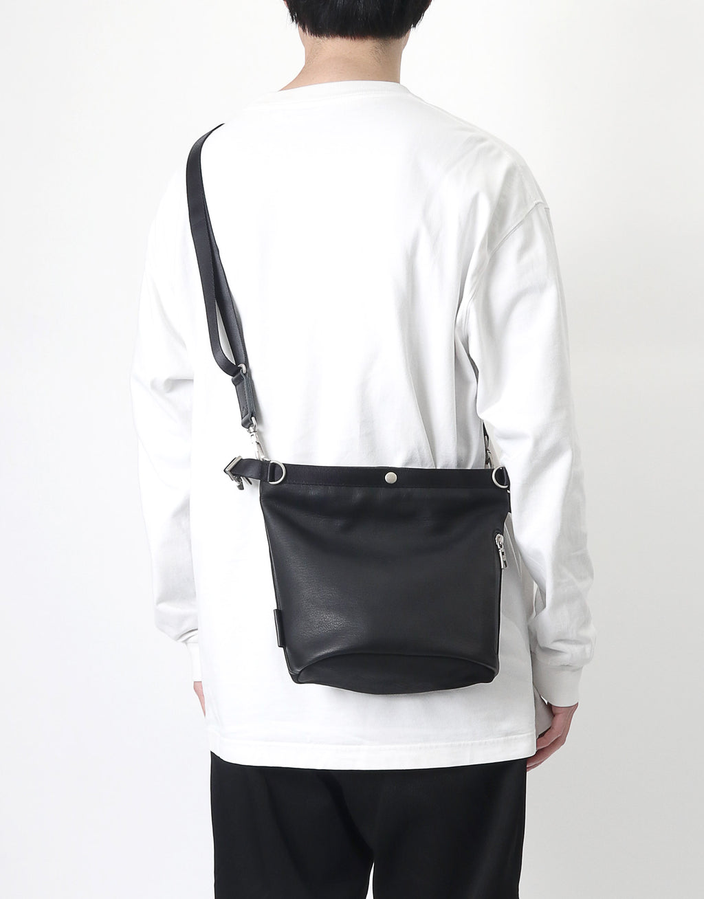 防水の機能性を持たせながらもソフトに仕上げられたレザーと、光沢感のあるナイロンテープを組み合わせたユニセックス・デザインのレザーバッグシリーズ。