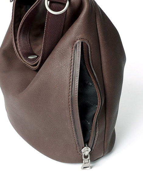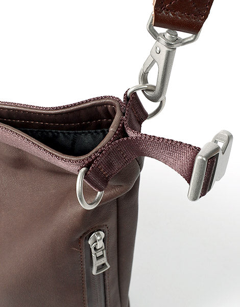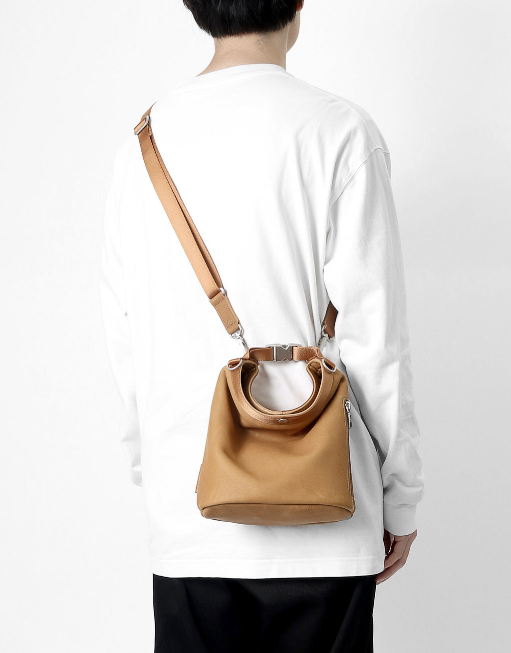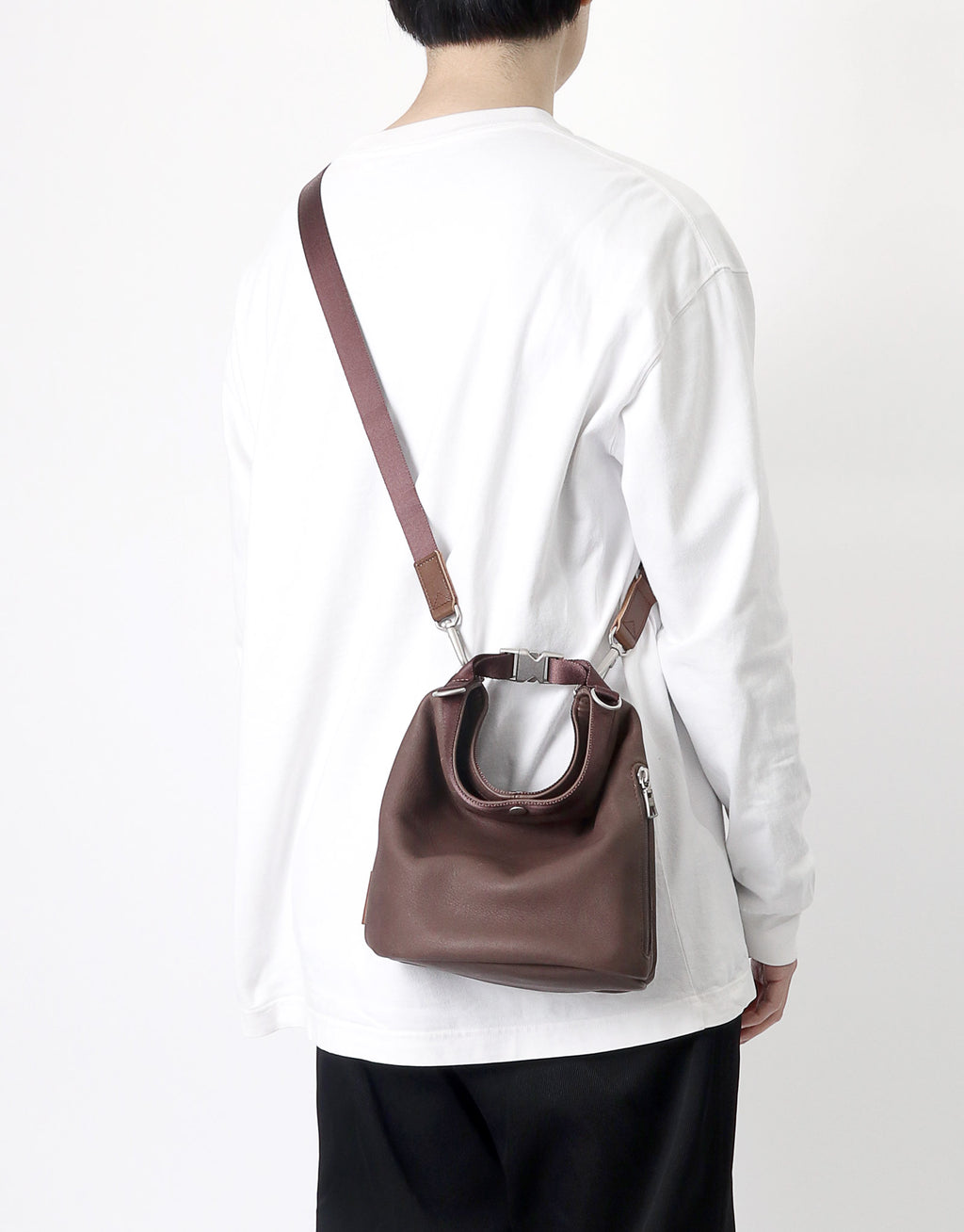 口元のバックルを脱着することで違うニュアンスで使用できるだけでなく、2箇所あるショルダーベルトの取り付け位置を替えることで、荷物の量に合わせた使い方が楽しめます。