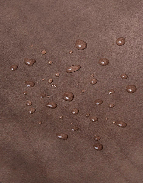 さらにその下地を空のドラムに入れて回し、元々ソフトな原皮をクロム鞣しと様々な加工によって、手に吸い付くようなしっとりした質感のレザーになり、その風合いをいかすために染料のみで仕上げを行っています。付属レザーは、日本皮革技術協会の 13 種の基準がある有害物質検査(JES) 済みで人体に有害な物質・六価クロムを一切使用せず、ベジタブルタンニンで鞣しています。また鞣しの段階で防水剤を入れ防水レザーに仕上げています。