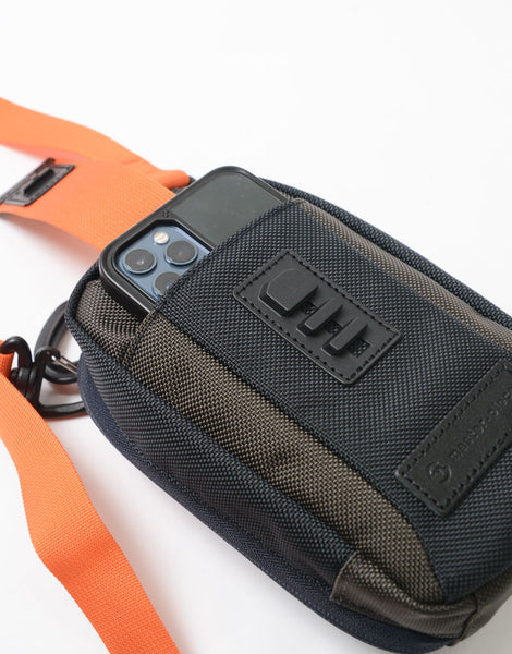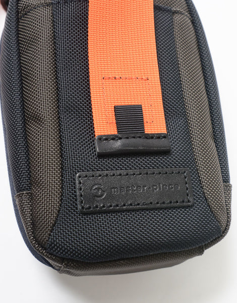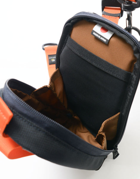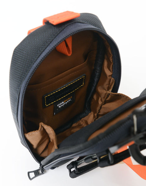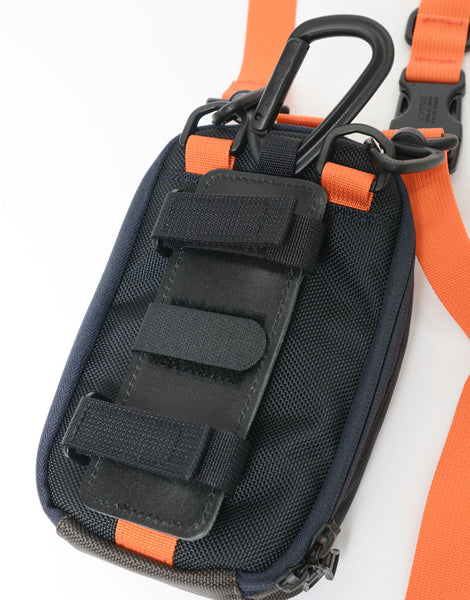 本体素材には通常のナイロンよりも耐久性を持ち、摩擦・引き裂きに強い CORDURA Ballistic® fabric1680d ナイロンを使用しています。タテ 840d ヨコ 840d の撚った糸を二本ずつ引き揃えることで、より摩擦・引き裂き強度が強化され、表面には撥水加工、裏面には PU コーティングを施しています。付属素材には日本 皮革技術協会の 13 種の基準がある有害物質検査 (JES) 済みで人体に有害な物質・六価クロムを一切使用せず、ベジタブルタンニンで鞣されたエコカウレザーを使用しています。機能面 ではワンタッチでポケットの開閉や本体の脱着ができる FIDLOCK 社の高機能パーツを使用しています。付属のショルダーストラップや他のバッグ、バックパックに取り付けるためのアタッチメント、カラビナを装備し様々な使い方が可能です。あまり荷物を持たないミニマリストに向けたバッグシリーズです。