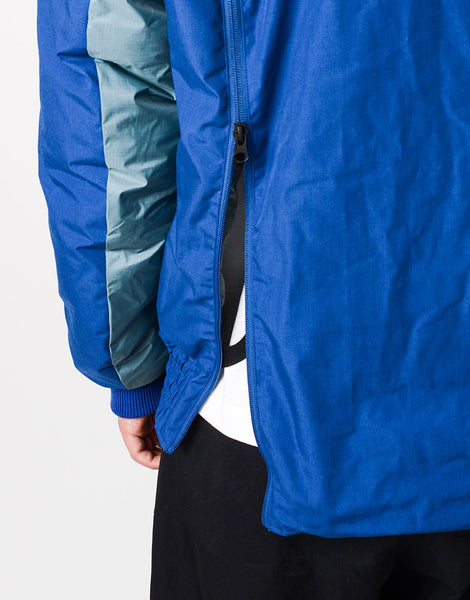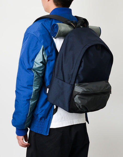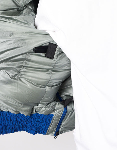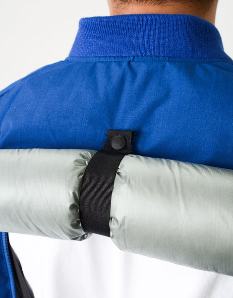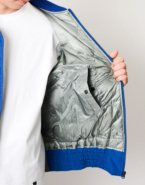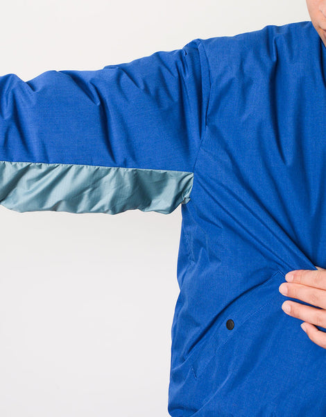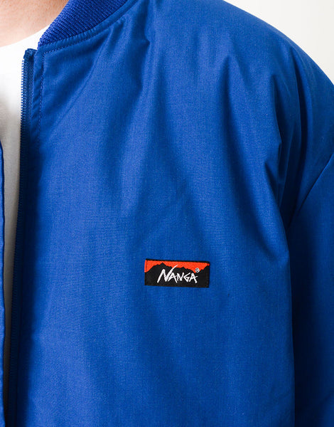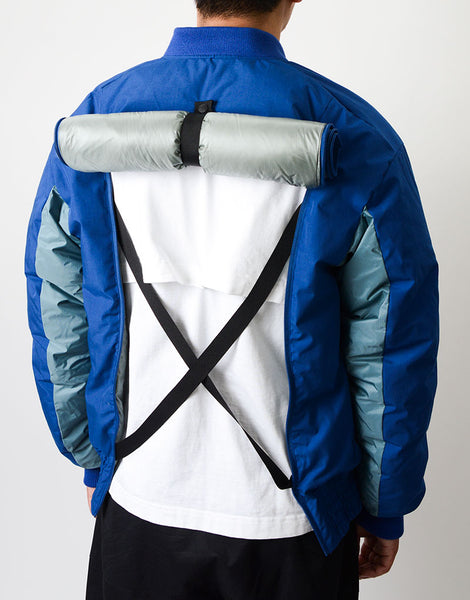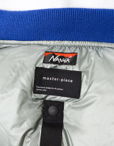 パッカーズダウンブルゾン NANGA とのコラボレーション。MA-1 をアレンジ ナンガの焚火ダウンと同じ生地を使用していますがこの生地はアラミド混で耐摩耗性が強いので バッグとの摩擦に強い特徴もあります。バックパック着用時、背中が暑すぎるストレスから解放できるよう 背中部分をロールアップできるディティールを搭載。 裾はバッグとの摩擦でダメージを負うのを防ぐため表生地のゴムギャザー仕様で対応しています。