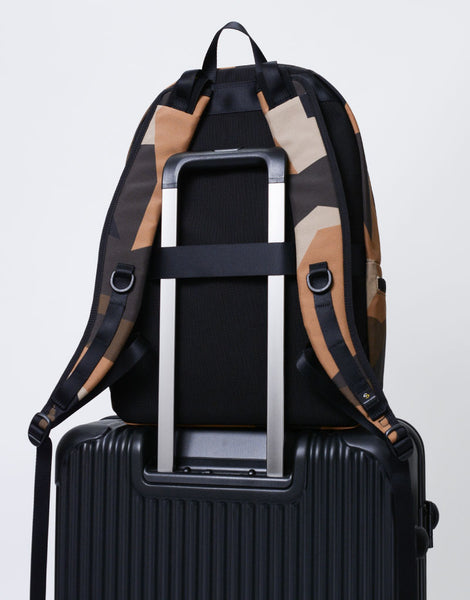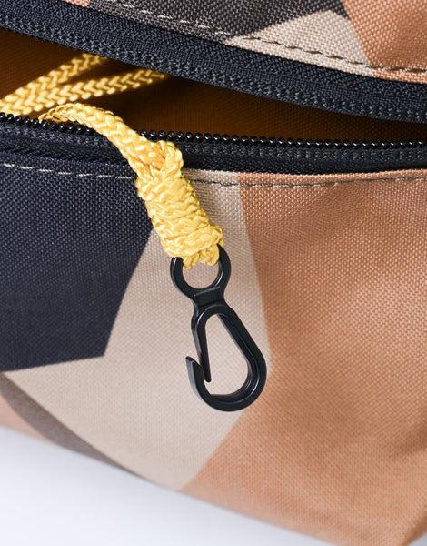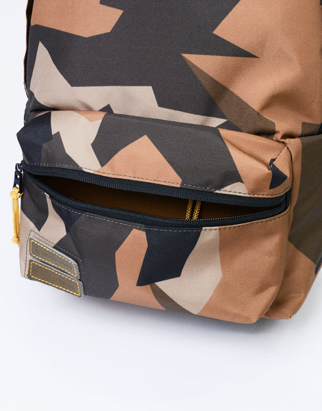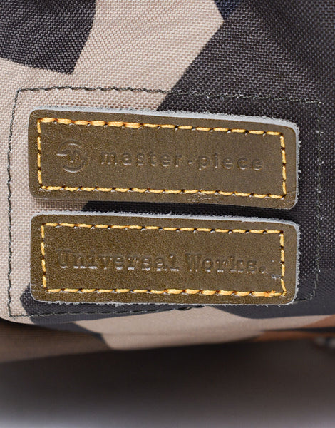 MULTIの本体素材には、タテヨコ共に600dのポリエステル糸をオックス織りした生地に、“Universal Works” がデザインしたオリジナルカモ柄をインクジェット昇華転写プリントし、さらに生地の表面に撥水コート加工を施し耐水性にも考慮した生地を使用しています。