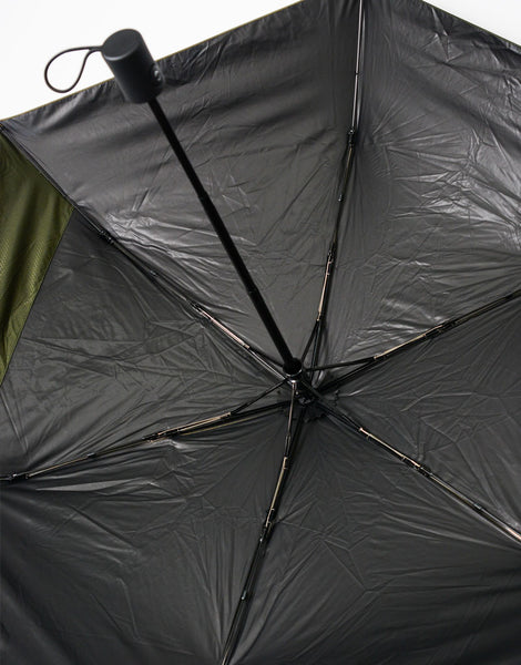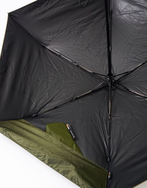 主体布料是CORDURA®使用符合brand fabric标准的30d的波纹尼龙线,具有抗摩擦、撕裂、磨损等强度的极薄CORDURA® 使用尼龙,背面使用安海尔公司的遮光膜“HEAT BLOCK”。根据这个HEAT BLOCK耐水度10000mm以上,遮光率99.99%以上,UV遮蔽率99.9%以上,隔热率40%,高耐久性。框架(伞骨)与亲骨的长度60cm、亲骨的根数6根相同规格的其他公司产品相比,重量约为210g,相当轻。而且自动开关很受欢迎,这种重量是其他的。在伞本体的内侧,有收纳伞袋的袋子,伞袋本身的嘴角也很宽,伞也很容易放入,另外也可以使用附带的彩色粉笔轻松安装。